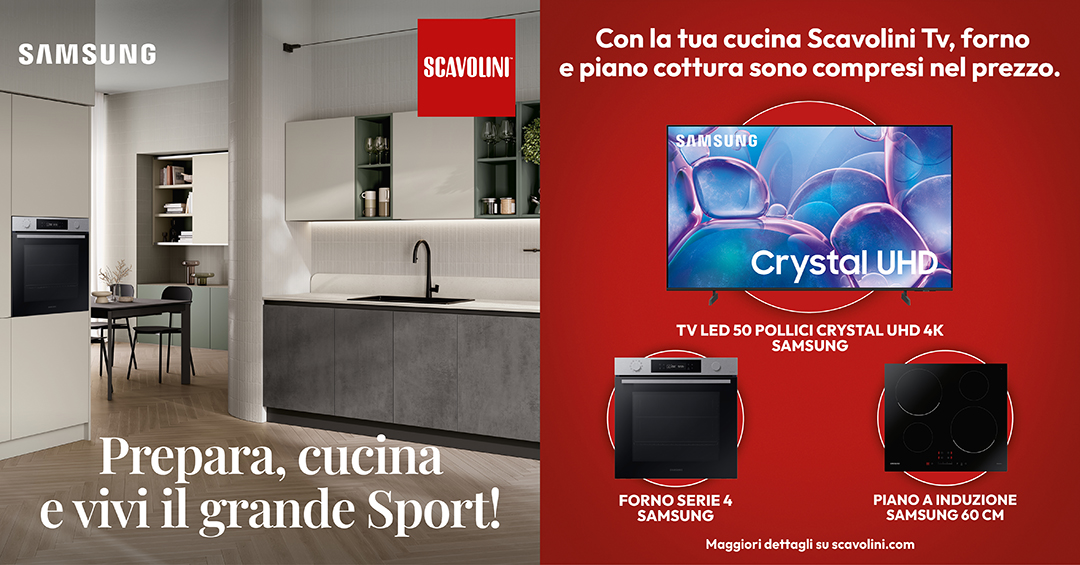 Prepara, cucina e Vivi il grande Sport! Con la tua cucina Scavolini piano cottura, forno e TV da 50″ sono compresi nel prezzo